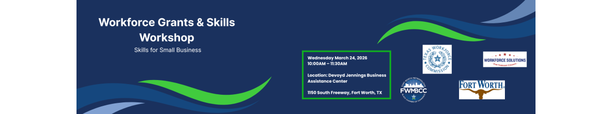 Don't miss this opportunity to learn how to access funding to train your small business employees. The Workforce Grants & Skills Workshop, hosted by the Fort Worth Metropolitan Black Chamber of Commerce (FWMBCC) in partnership with the City of Fort Worth Economic Development Department and Workforce Solutions for Tarrant County, connects small business owners and job seekers to funding and training opportunities that strengthen workforce capacity. This session provides practical tools and direct access to regional partners committed to driving economic growth across Fort Worth and Tarrant County.